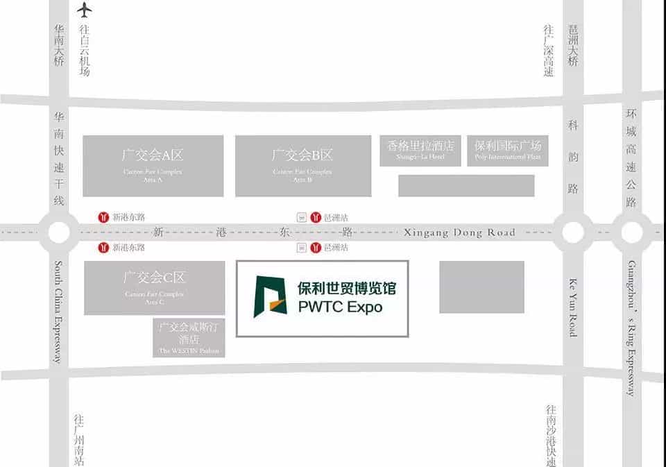 ②搭乘機場快線三號線,于“珀麗酒店”站下車,然后轉 乘地鐵8號線抵達“琶洲站”,從C出口出站直達。