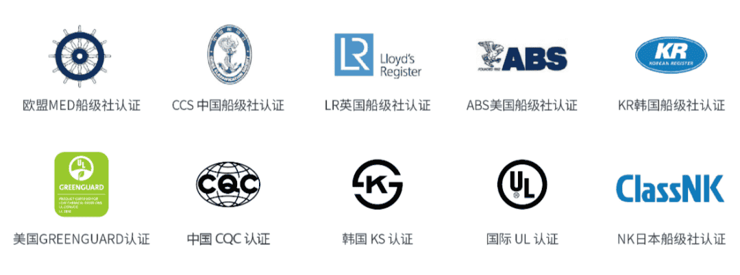 目前,贏勝船用材料先后通過CCS、ABS、KR、LR、MED、NK等船級社認證及中船725所、中船702所、海醫所、遠東防火中心等權威檢測機構的相關檢測。