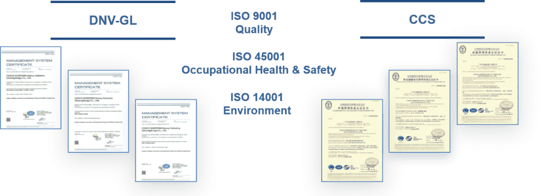 公司已獲得DNV-GL和CCS的ISO9001/ISO14001/ ISO45001/ISO50001雙體系認證,以及EN1090、EN3834等國際認證,是華南地區規模最大的船舶修造及鋼結構加工制造企業之一。