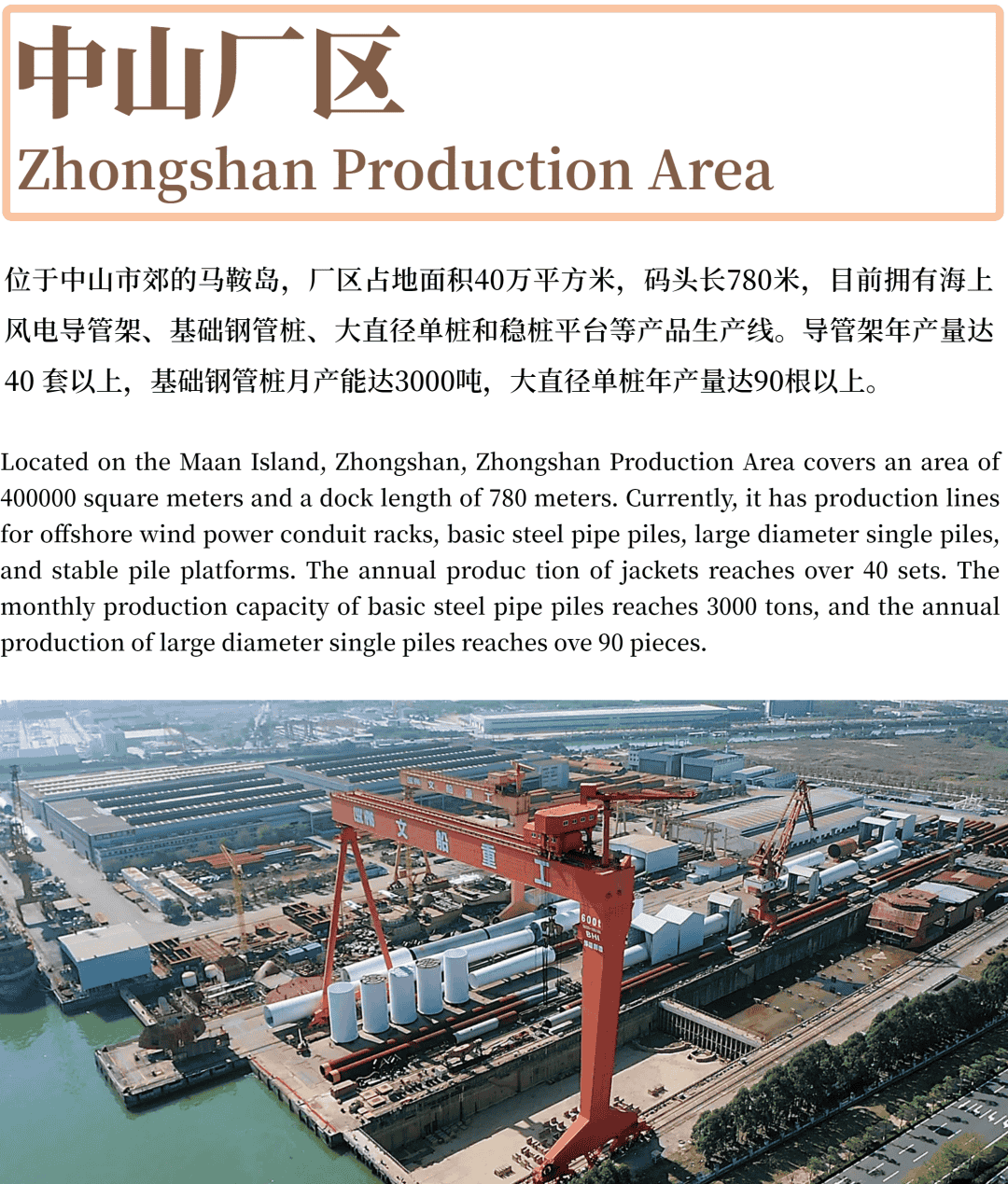 The company has built the world's first R-550D 400 feet self elevating drilling platform, Z210 multifunctional platform (LIFETBOAT), and marine residential platform, covering the entire process of offshore oil and gas exploitation. The company serves development of clean energy for offshore wind power, and has built 800t, 1200t, 1600t, 2000t and other series of offshore wind power installation platforms, contributing to the mission of "carbon neutrality carbon peak".